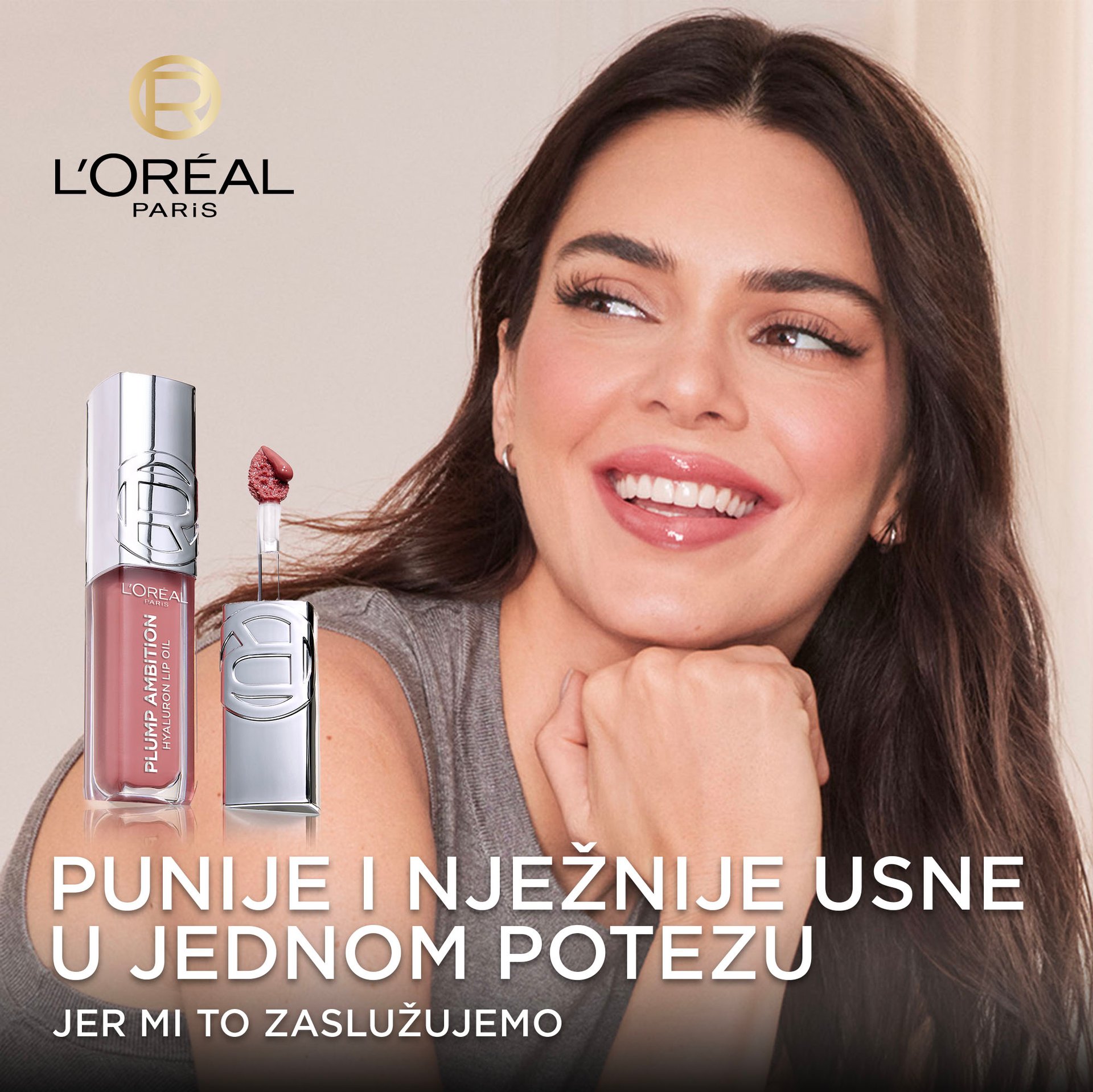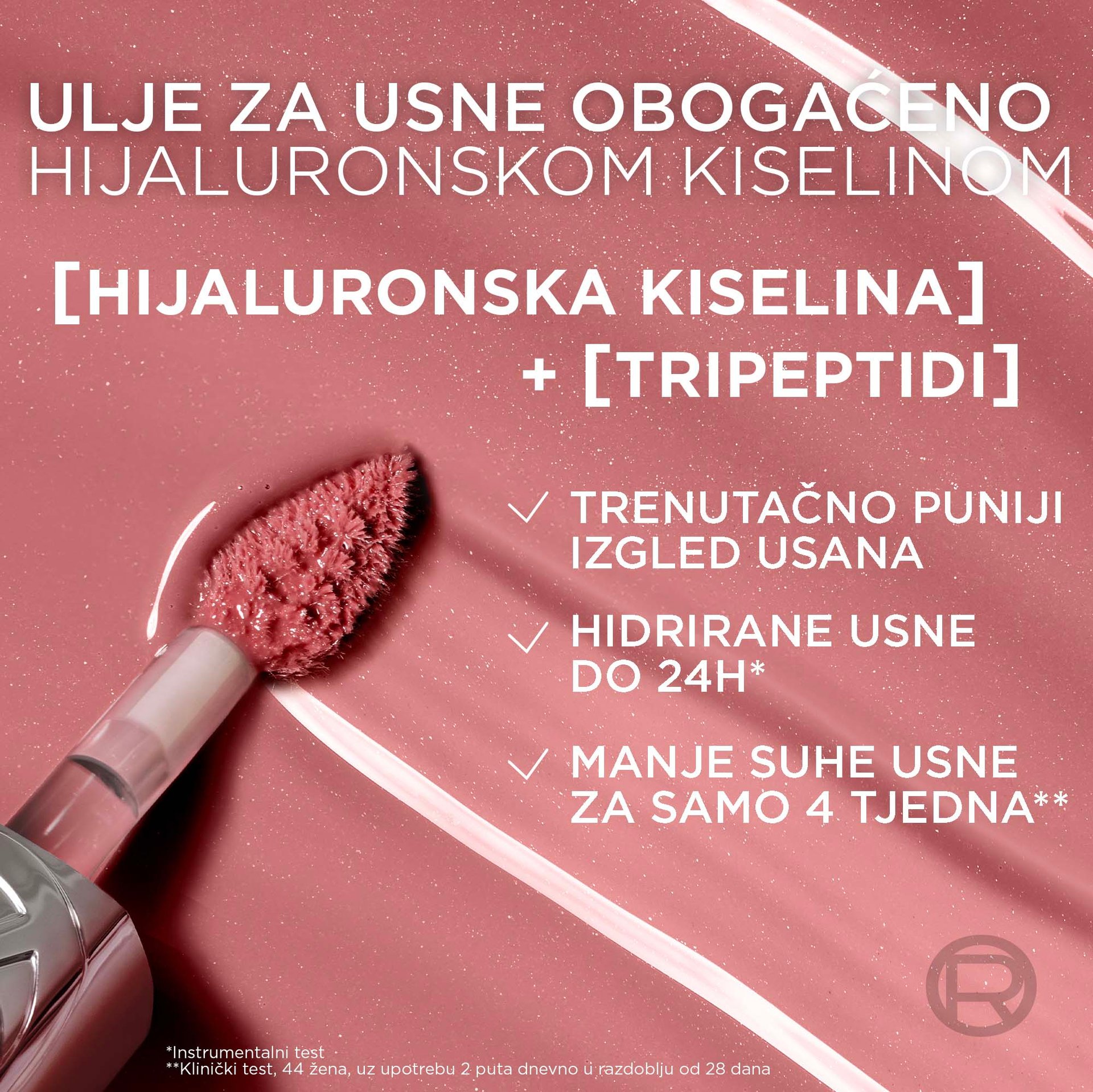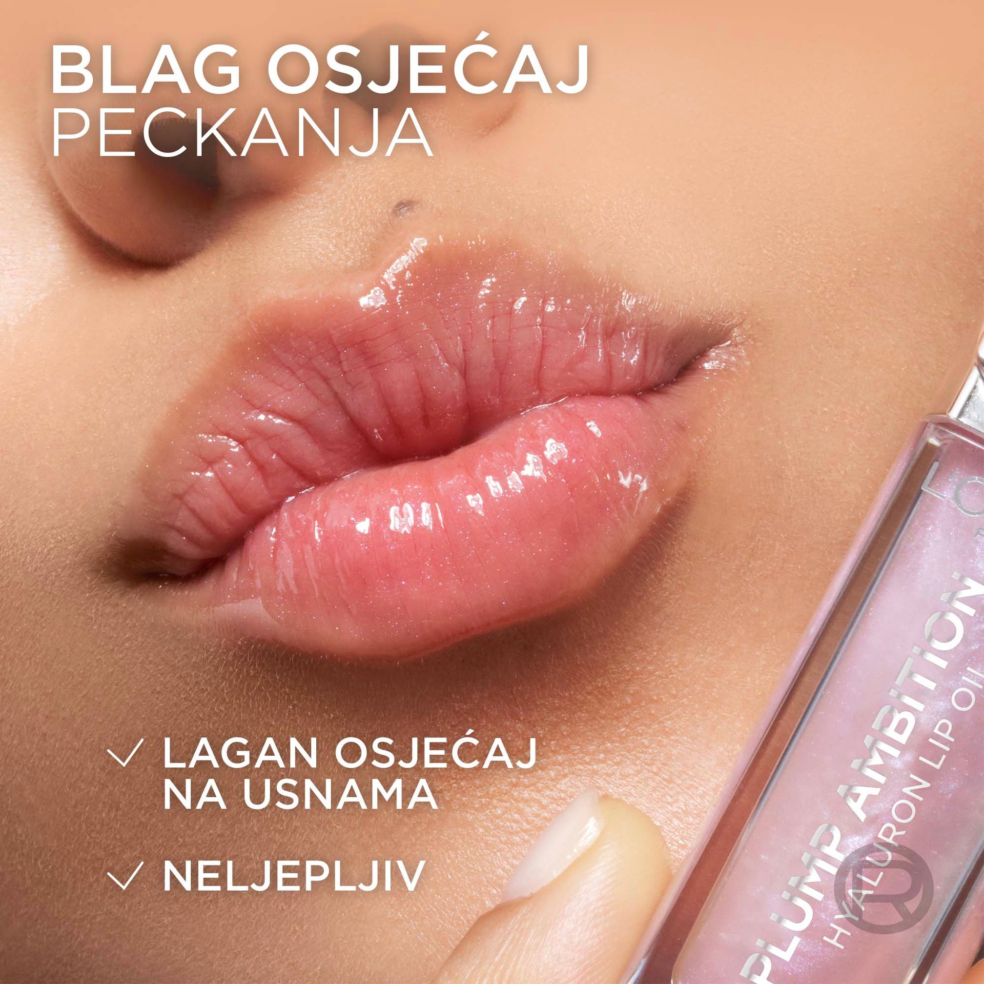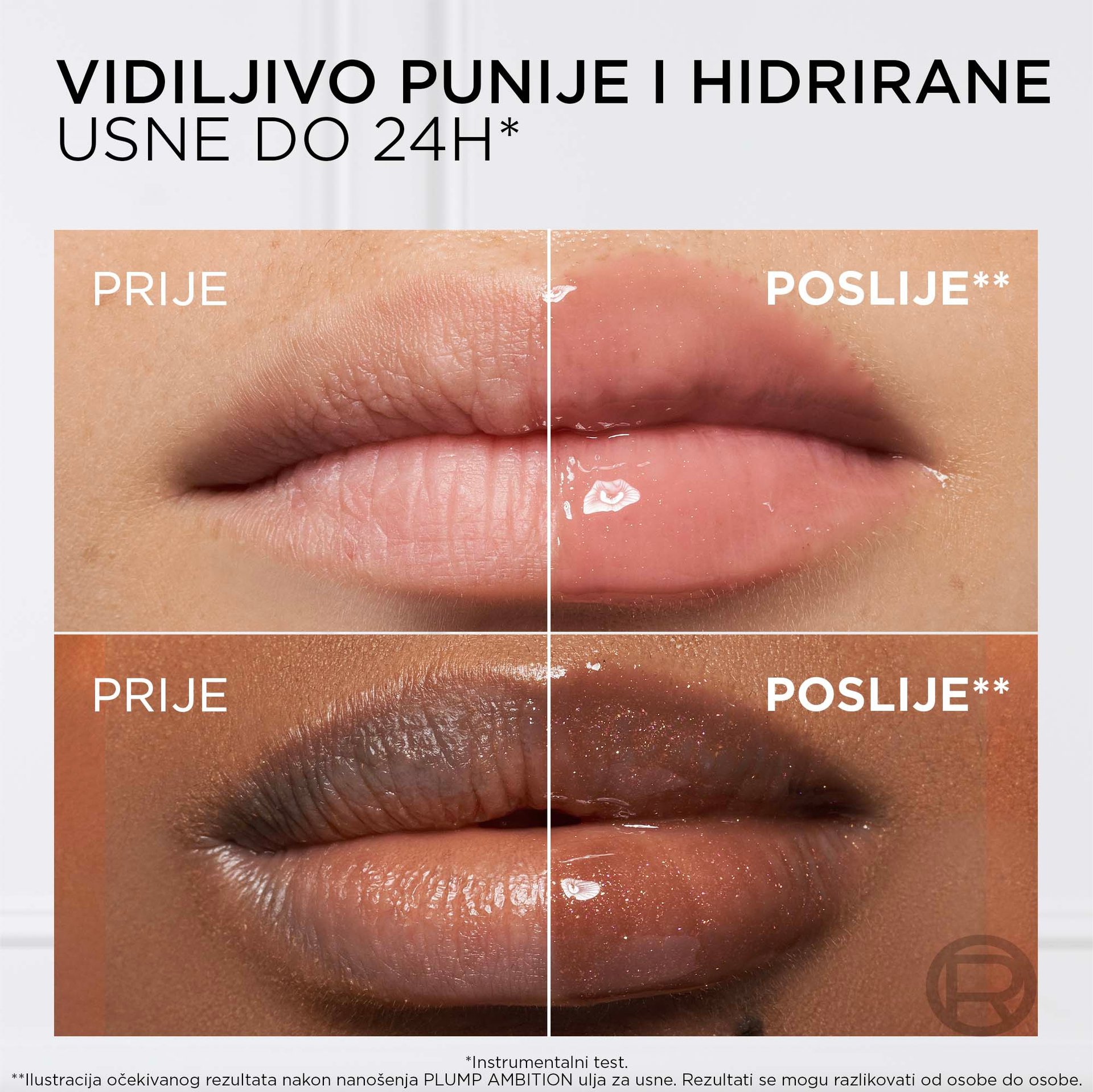 Tvoja ambicija u punom sjaju! Plump Ambition ulje za usne obogaćeno hijaluronskom kiselinom za učinak vidljivo punijih usana, hidrirane do 24 h*.